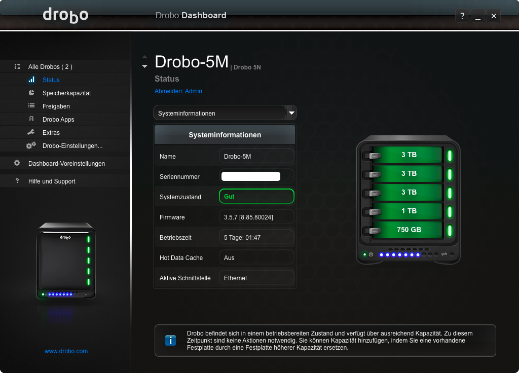 unterwegs war, schickte mir einer meiner DROBOs eine Email, dass es ein Problem mit der Ausfallsicherheit gebe, da mit einer Platte etwas nicht stimmte. Kurze Zeit später kam eine Mail, dass der DROBO die Ausfallsicherheit wieder herstelle und schließlich noch eine Mail, dass die Ausfallsicherheit wieder gegeben sei. Die Abstände dazwischen waren nur wenige Minuten, so dass ich etwas stutzig wurde. Wäre eine Festplatte komplett ausgefallen, hätte der Wiederherstellungsvorgang deutlich länger dauern müssen.